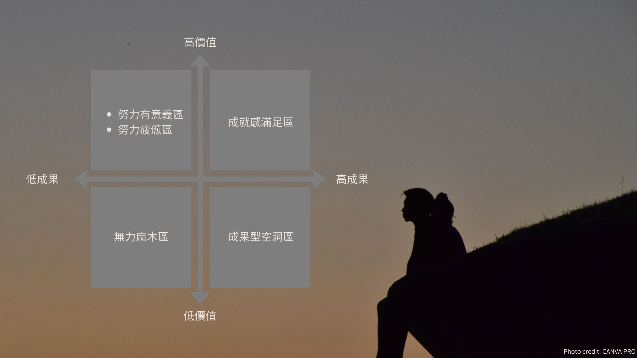 接下來,我會分享這張矩陣圖的四個象限,並運用心理學理論,一步步走回自己內在的成就地圖。